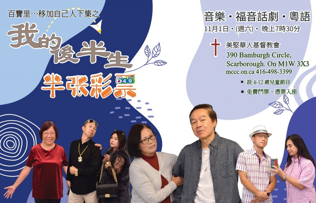 音樂福音話劇「百寶里…移加自己人之我的後半生 – 半張彩票」於11月1日晚上7: 30在教會禮堂舉行。多位弟兄姊妹參與演出,話劇反映人生百態,與恩主相遇。徐武豪博士屆時分享福音。歡迎社區朋友出席,憑票入座。10月12日開始於主日崇拜期間在外廊接受登記及領取免費入場劵,亦可聯絡教會辦公室索取門票。