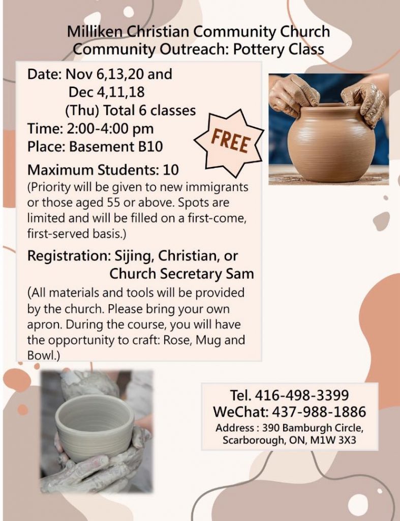 All materials and tools will be provided by the church. Please bring your own apron. During the course, you will have the opportunity to craft: Rose (玫瑰花), Mug (杯子), Bowl (盆子).