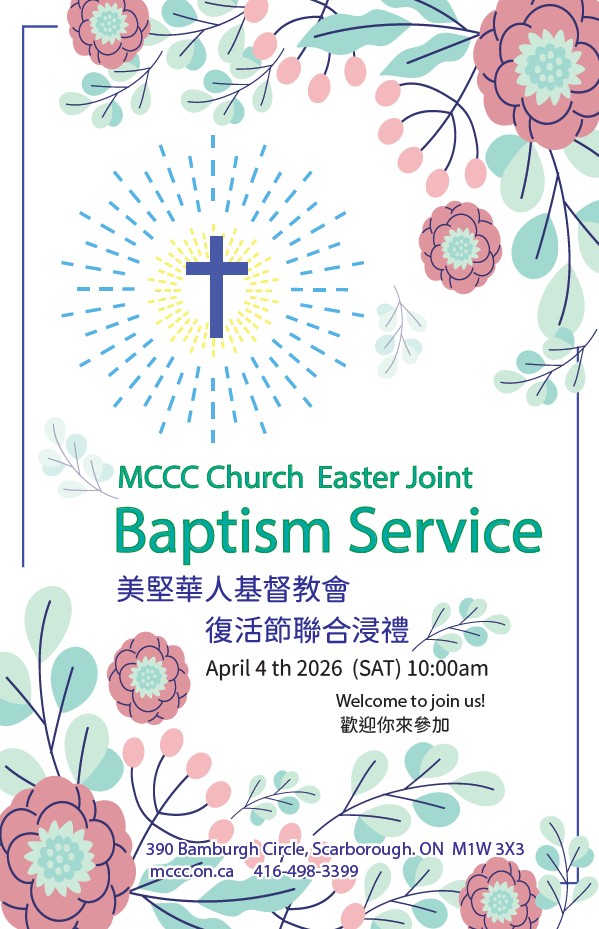 Good Friday Services will be held on Friday, April 3. The Mandarin and English services will be at 10:30 a.m., and the Cantonese service will be at 2:00 p.m.
